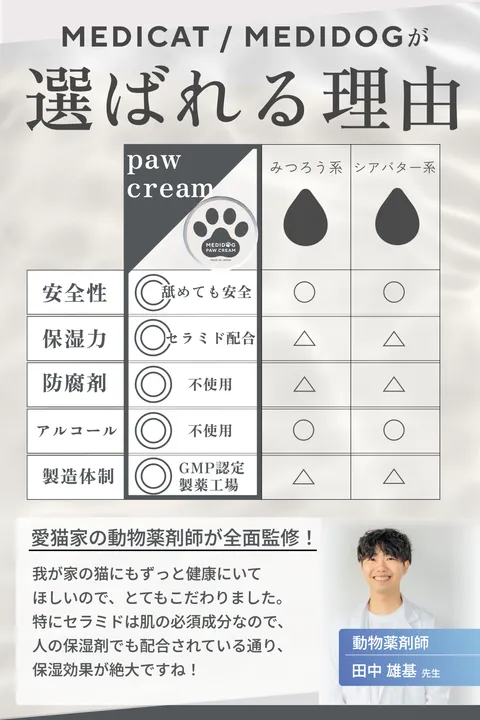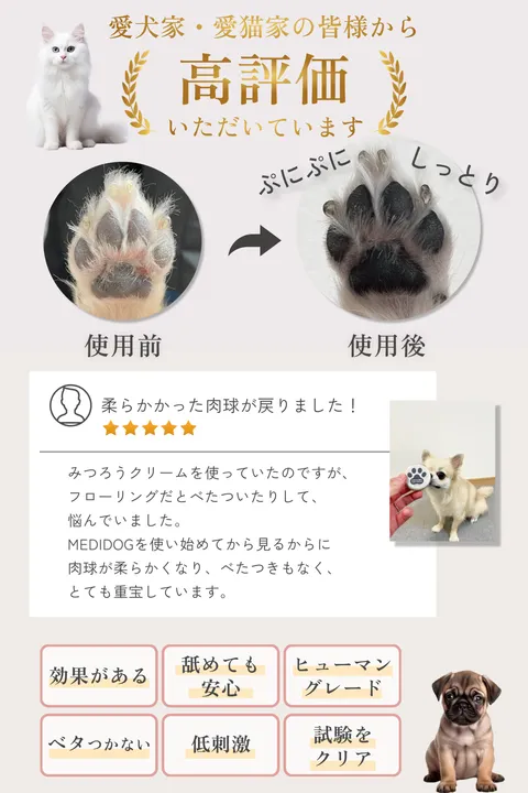 ●肉球の乾燥やひび割れを防ぎ、固くなってしまった肉球を柔らかくするほどの保湿力の高さで、無香料・天然成分配合です。